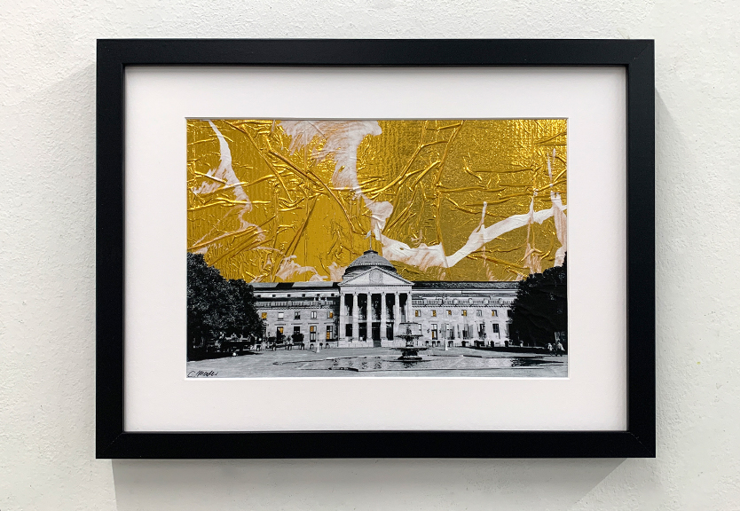 Collage, Scherenschnitt, Rettungsdecke, Papier und Acryl auf Papier