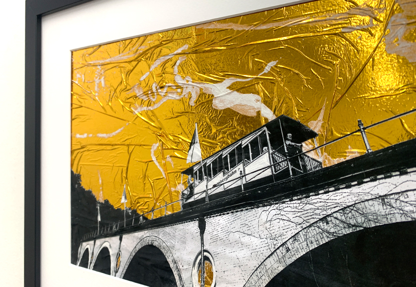 Collage, Scherenschnitt, Rettungsdecke, Papier und Acryl auf Papier